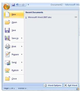 Office Button berisi perintah-perintah yang berkaitan dengan dokumen seperti membuat dokumen baru (New), membuka dokumen (Open), menyimpan dokumen (Save), mencetak dokumen (Print), dan sebagainya (Gambar 2.2).